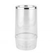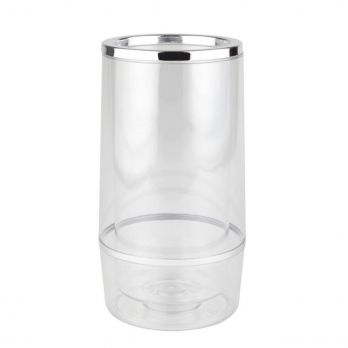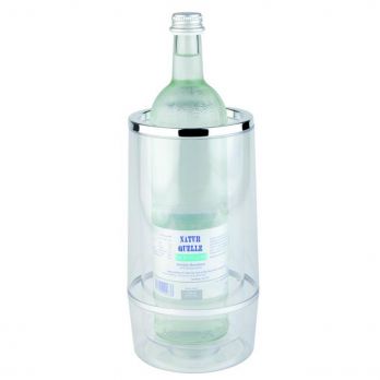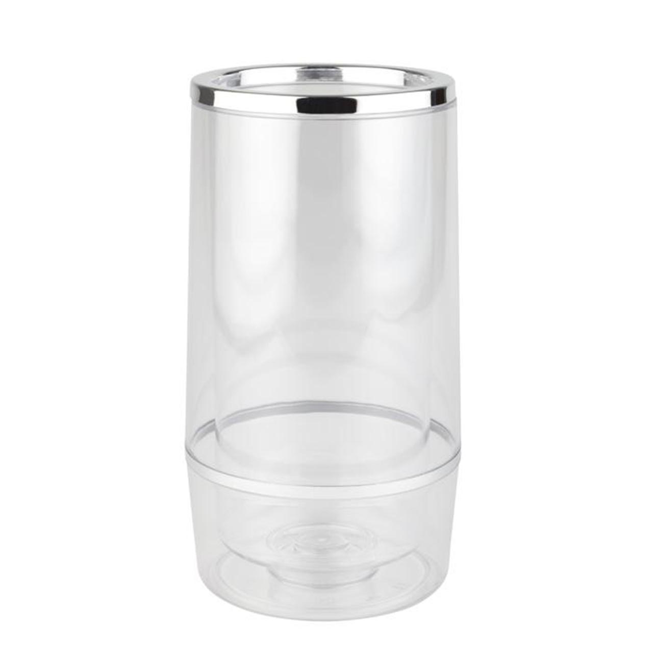 Praktický chladič na láhve z průhledného polystyrenu, dvojstěnný pro nejlepší izolaci. Ideální pro elegantní chlazení vína, šampaňského nebo vody doma či v gastronomii. Chromovaný okraj dodává moderní a stylový vzhled. Rozměry: 11,5 x 11,5 cm, výška 23 cm.