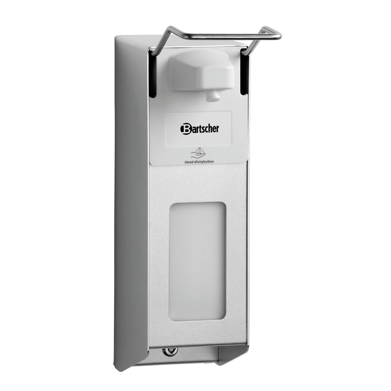 Dávkovač vhodný pro EURO lahve. Barva stříbrná, bílá. Pro připevnění na zeď. Obsah 1 litr. Znovu naplnitelné. Plastová transparentní nádoba pro kontrolu hladiny. Obsluha loktem manuálně. Systém dávkovací pumpy, sprejový systém, až 4 ml jedním tahem. Uzamykatelný, včetně klíče a nástěnného držáku. Náplň není součástí balení. Materiál hliník. Rozměr: Š 93 x H 200 x V 330 mm. Hmotnost 0,834 kg.