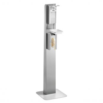 Kompletní dezinfekční stojan obsahuje: hygienický sloupek (1 základna, 1 sloupec), dezinfekční dávkovač, dávkovač rukavic, odkapávač. Masivní nerezové provedení, stojí na rovných plochách bez uchycení. Materiál nerezová ocel, hliník, PP, plast ABS. Včetně upevňovacího materiálu, 1 nástěnný držák. Jednoduchá montáž. Zásobník na rukavice určený pro jednorázové rukavice ve standardním kartonu, rozměry kartonu max.: Š 250 x H 130 x V 78 mm, kapacita dávkovače rukavic 1 krabice. Obsah 0,9 litru, bez náplně, znovu naplnitelné, vhodné pro euro lahve 1000 ml. Pumpový systém, rozprašování (až 3 ml na jedno stlačení). Ovládání manuální jednou rukou, loktem. Průhledná plastová nádoba pro kontrolu náplně. Sběrná nádoba vyjímatelná, vhodná do myčky, rozměry: Š 147 x H 240 x V 40 mm. Zásobník na rukavice se zadní pružinou uvnitř pro pevné držení. Rozměr: Š 400 x H 400 x V 1462 mm. Hmotnost 12,1 kg. Součástí dodávky není náplň dezinfekce ani rukavic.