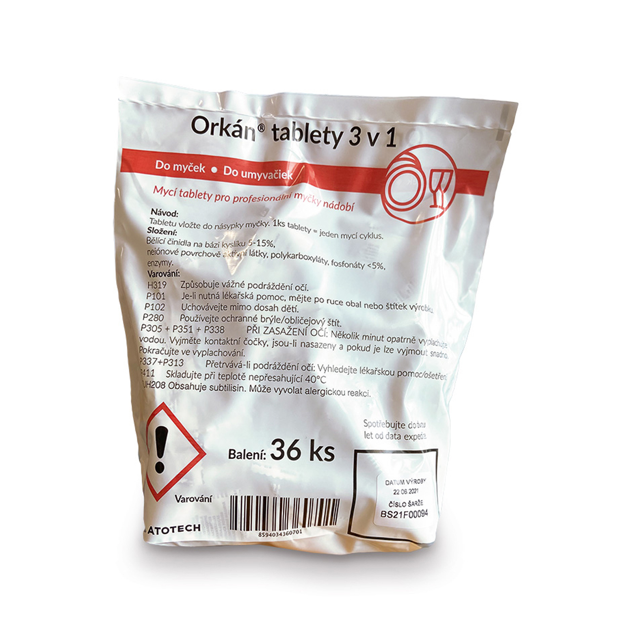 Třífázové mycí tablet pro profesionální myčky nádobí Orkán® TABLETY 3v1 jsou mycí tablety s třífázovým účinkem pro všechny typy myček nádobí malého a středního výkonu. Jejich speciální složení a moderní provedení zajišťuje: jednoduché dávkování, třífázový mycí účinek pro bezproblémové odstranění nečistot a v kombinaci s produktem Orkán® PROFI lesk následně zářivý lesk nádobí, příborů a sklenic. Orkán® TABLETY 3v1 jsou optimální pro všechny malé a střední profesionální myčky nádobí s univerzálním použitím pro všechny druhy nádobí příborů a sklenic s výjimkou mytí hliníku. Tabletovaná struktura přípravku zabezpečuje optimální rozpouštění. Návod k použití: Orkán® TABLETY 3v1 dávkujte TABLETU 3v1 po napuštění myčky do ohřáté mycí vody. 1 TABLETA 3v1 na každých 15 litrů mycí vody.