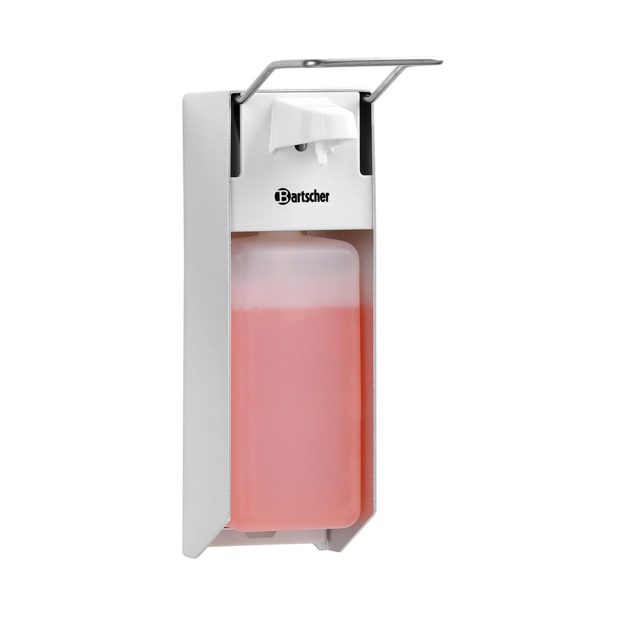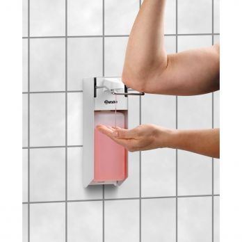 Zásobník tekutého mýdla nástěnný pro použití v gastronomických provozech, hotelech, letištích atd. Materiál hliník. Ojem 0,9 litrů, vhodný pro EURO lahve 1000 ml. Manuální obsluha loktem. Pumpa, až 3 ml na stlačení. Průhledná, znovu naplnitelná nádoba pro konrolu náplně. Rozměry: 95 (Š) x 222 (H) x 330 (V) mm. Včetně držáku na stěnu a upevňovacího materiálu. Dodáváno bez tekutého mýdla. Hmotnost: 0,65 kg.