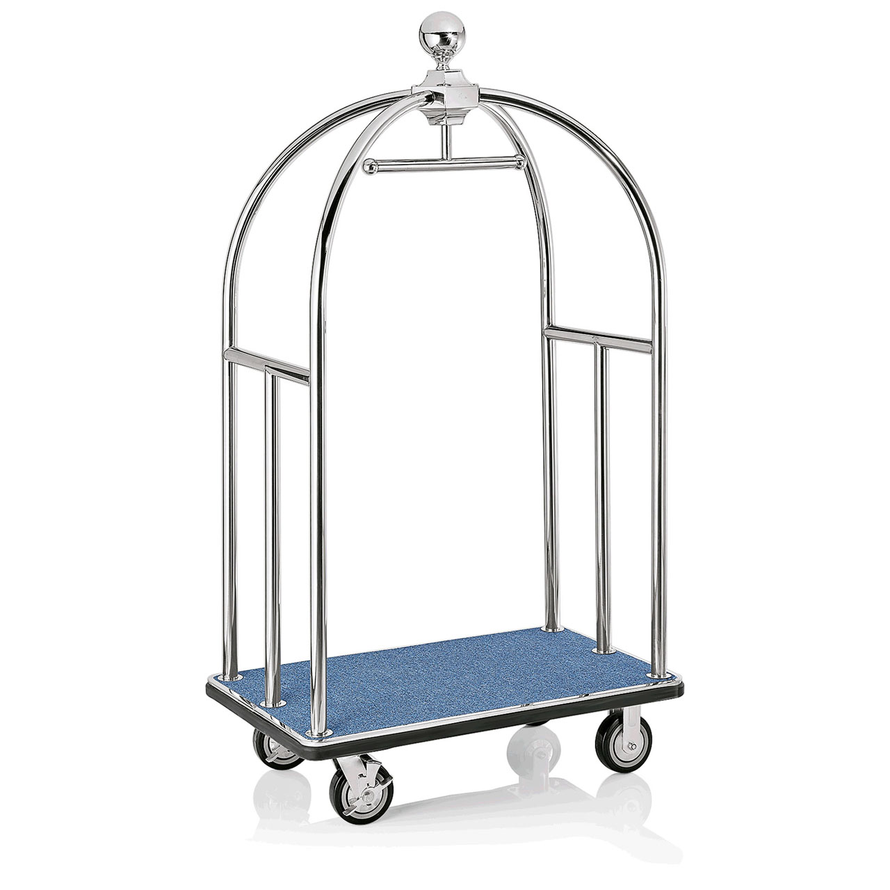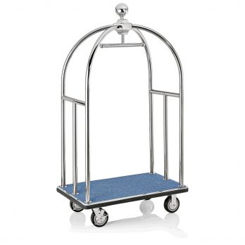 Transportní vozík na zavazadla UNITY, 112 x 60 x 185 cm, stříbrné provedení, leštěný vzhled, modrá barva koberce, chromniklová nerezová ocel. Vhodné pro použití v hotelu.