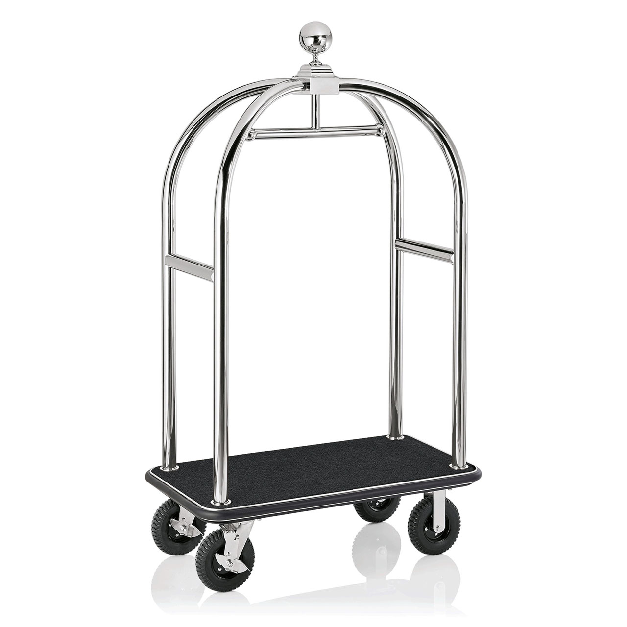 Transportní vozík na zavazadla, 112 x 60 x 190 cm, stříbrné provedení, černá barva koberce, chromniklová nerezová ocel 18/8. Vhodné pro použití v hotelu.