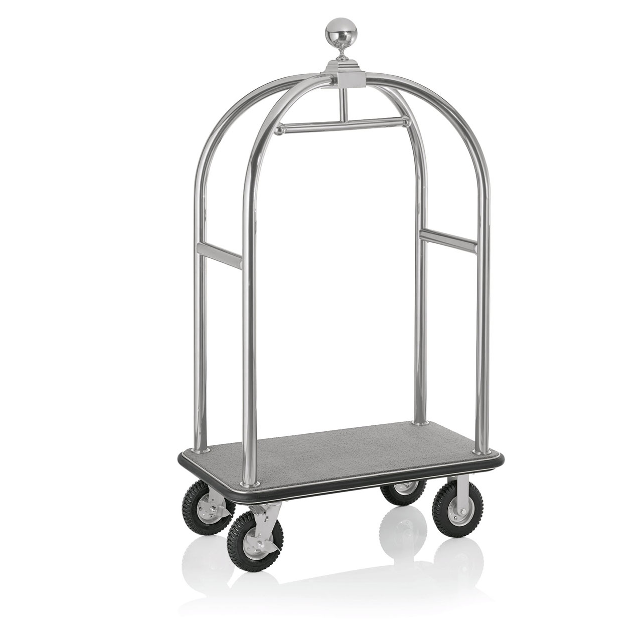 Transportní vozík na zavazadla, 112 x 60 x 190 cm, stříbrné provedení, kratáčovaná úprava, šedá barva koberce, chromniklová nerezová ocel 18/8. Vhodné pro použití v hotelu.