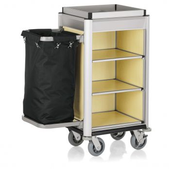 Vozík pro hotelový servis ISABELLA, 95 x 55 x 116 cm, s tmavými rohy, vzhled světlého dřeva, hliník, MDF, sklolaminát. Vhodné pro použití v hotelu.