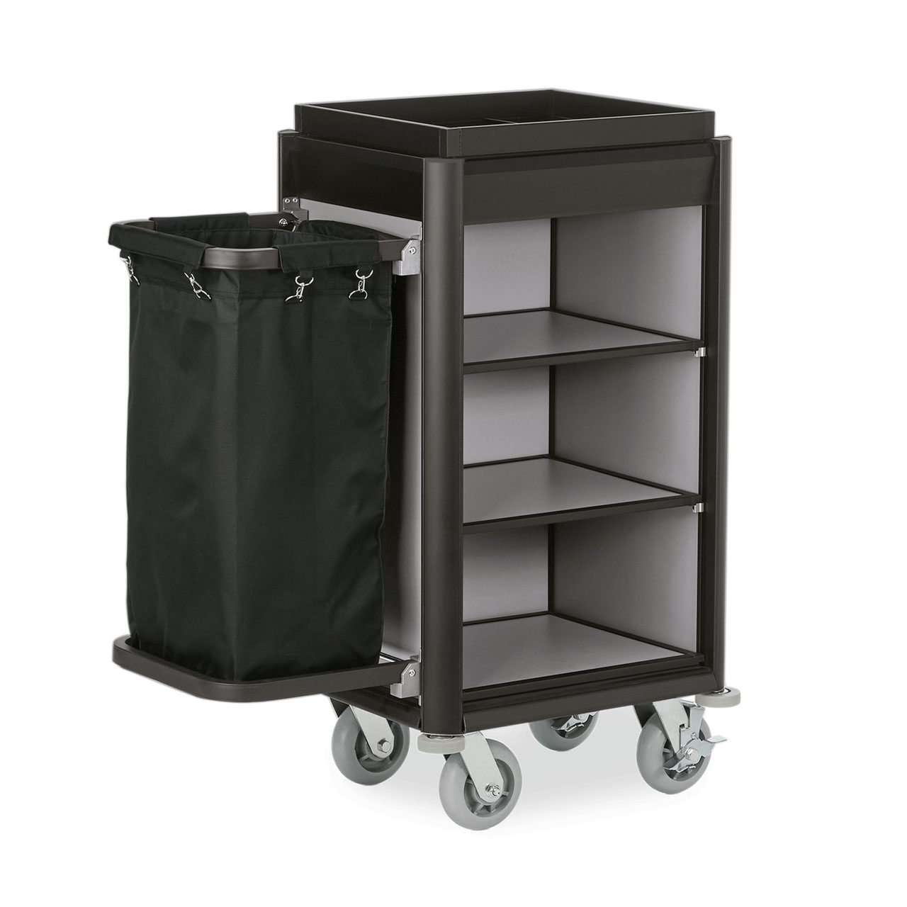Vozík pro hotelový servis ISABELLA, 95 x 55 x 116 cm, s tmavými rohy, hliník, MDF. Vhodné pro použití v hotelu.