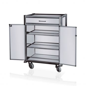 Servisní vozík na minibar, 85 x 60 x 135 cm, bílá s mavými hranami, hliník, MDF. Funkční a elegantní servisní vozík určený pro doplňování minibarů v hotelových pokojích. Kombinace kvalitních materiálů a moderního designu zajišťuje dlouhou životnost i reprezentativní vzhled při každodenním použití.