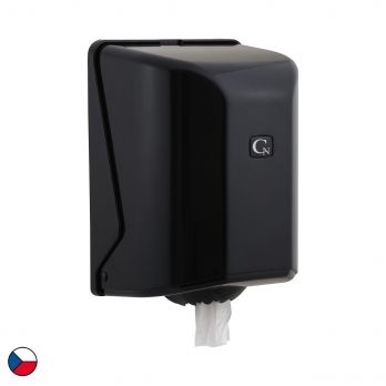 Nástěnný zásobník černý na papírové ručníky v roli o rozměru 20x20 cm odvíjené středem. Je praktický do provozů, kde je větší spotřeba papírových utěrek, jako jsou kuchyně a dílny. Vyroben je z černého plastu s černou základnou. Lze montovat pouze na vruty. Rozměry hloubka, šířka, výška: 210x220x310 mm.
