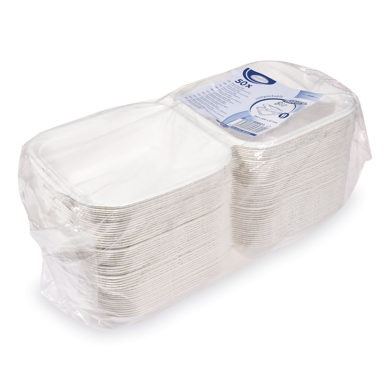Menu box nedělený z cukrové třtiny. Délka 21,8 cm, šířka 20,7 cm a výška 6,4 cm.