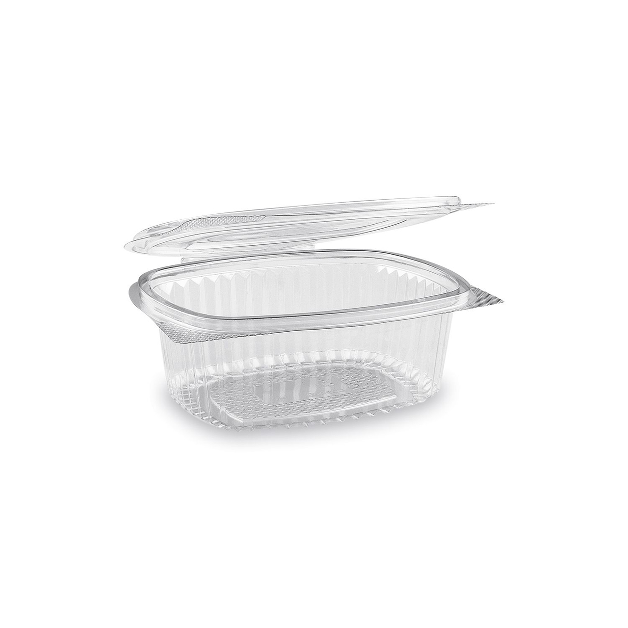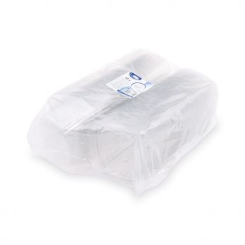Miska oválná průhledná s víčkem 500 ml (rPET). Průměr 12,4 cm, výška 5,5 cm.