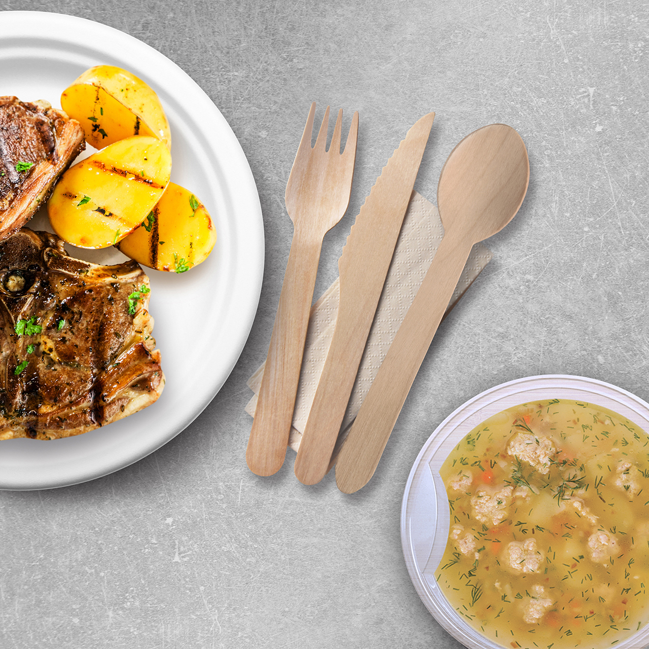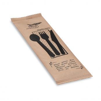 Sada dřevěných příbor (lžíce, nůž a vidlička) v uzavřeném sáčku s papírovým ubrouskem. Délka příborů je 16,5 cm.