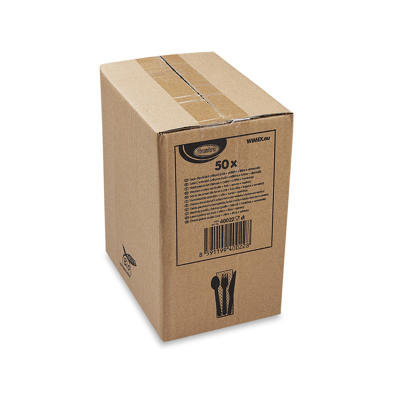 Sada dřevěných příborů (Nůž, Vidlička, Lžíce a Ubrousek) (50 ks)