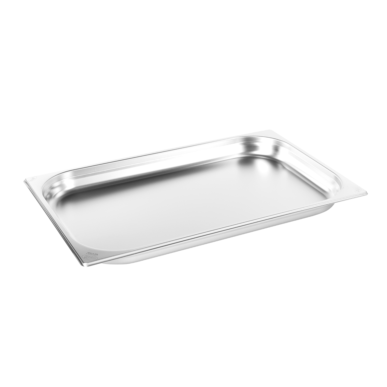 Nerezová gastronádoba - hloubka 40 mm - objem 4,5 l. Tloušťka materiálu gastronádoby udávaná výrobcem je 0,6 mm