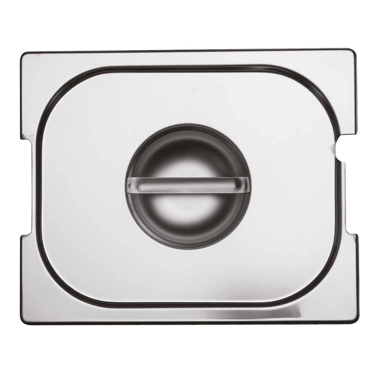 Nerezové víko na gastronádobu GN 2/3 s výřezy pro držadla a pro naběračku.