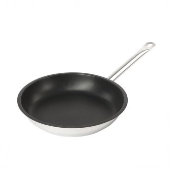 Nerezová pánev 18/10 se sendvičovým dnem, potažená odolným teflonovým povrchem. Vhodná na všechny typy varných desek. Vhodná do myčky.