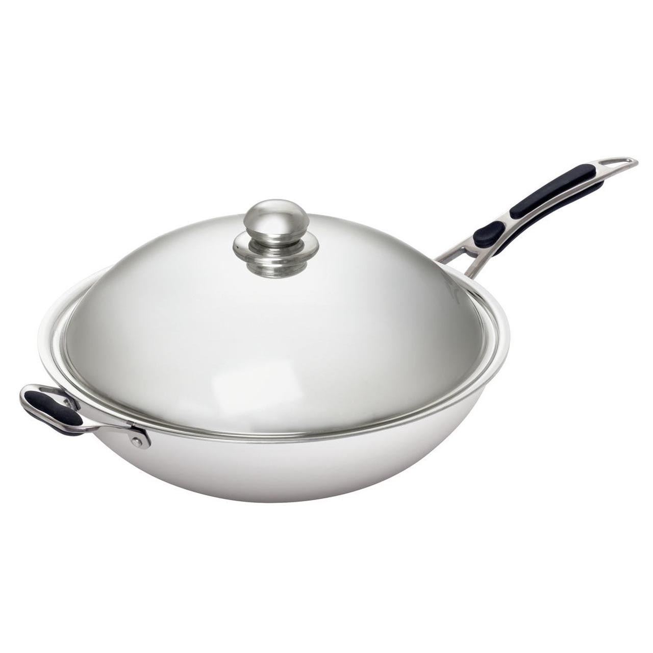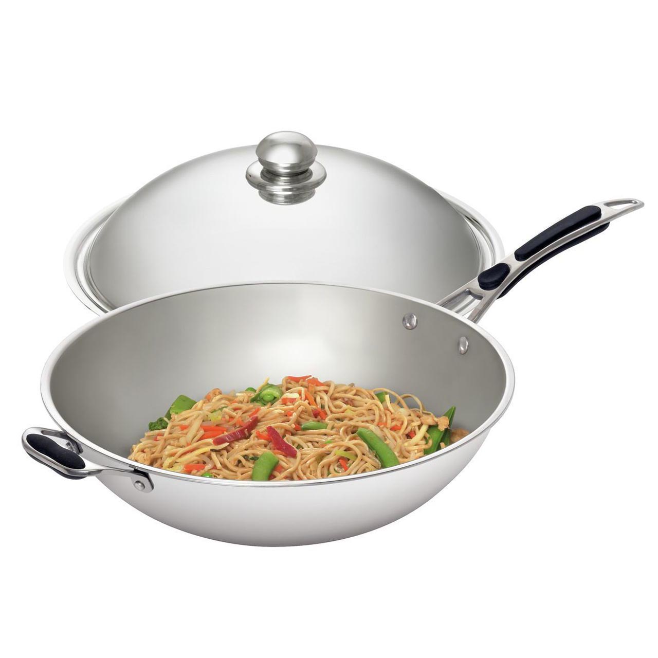 Pánev wok z nerezové potravinářské oceli, s rukojetí a bočním držadlem. Rozměry: pr. 360 mm, 110 (V) mm. Objem: 6,0 litrů. Součástí: poklice z nerezové potravinářské oceli . Hmotnost: 2,9 kg.