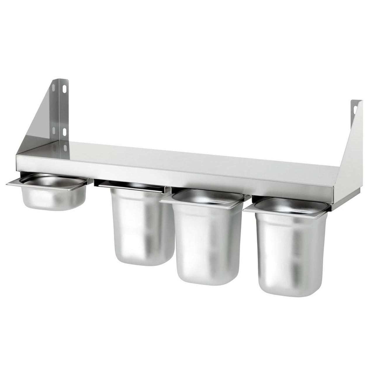 Z nerezové potravinářské oceli, se vsuvy pro GN. Včetně upevňovacího materiálu. Rozměry: 800 (Š) x 200 (H) x 150 (V) mm. Pro 4 x 1/6 GN. GN objednávejte samostatně! Hmotnost: 3,2 kg.