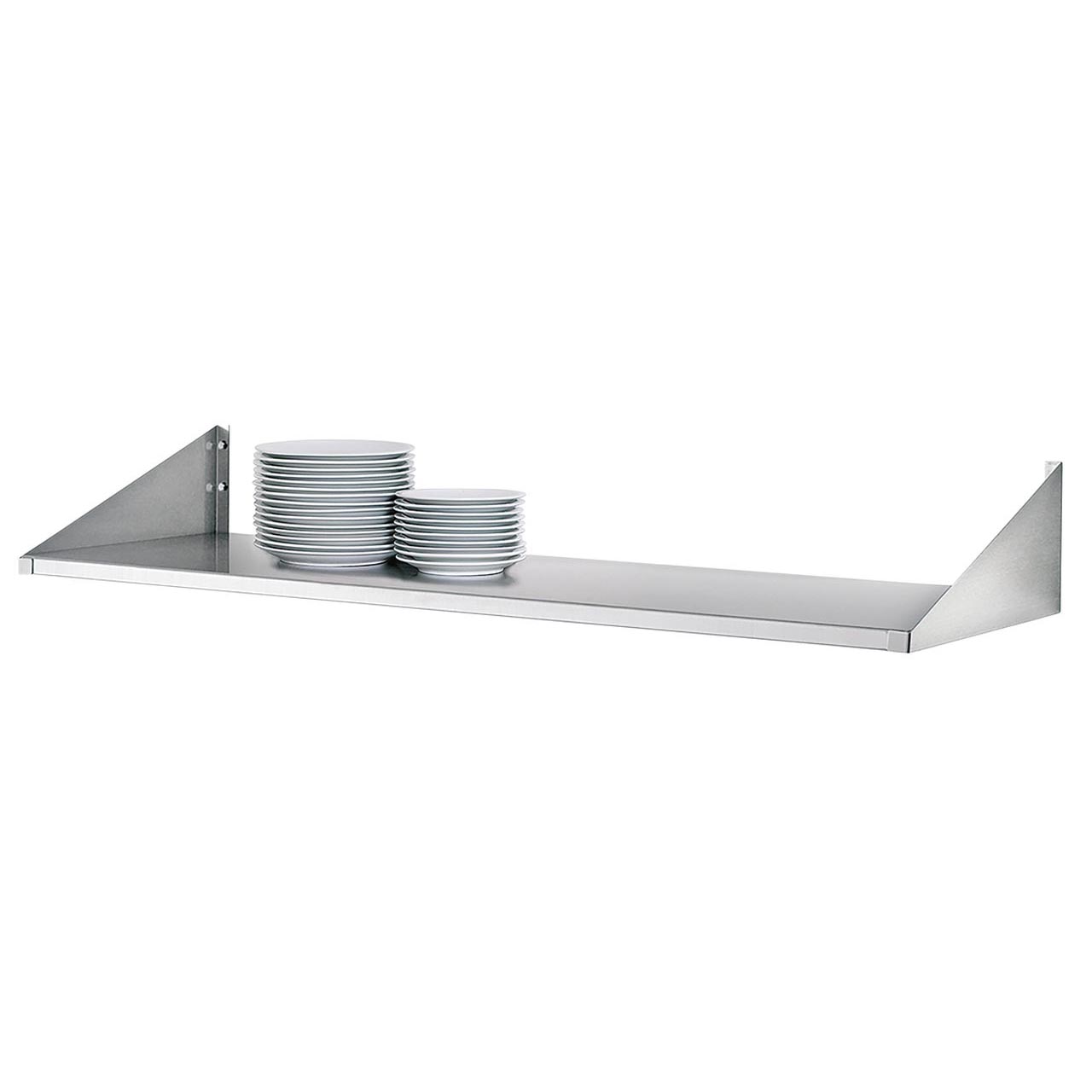 Nástěnná police v těžkém provedení. 1 police na talíře a dva boční díly. Včetně upevňovacího materiálu. Jednoduchá montáž. Materiál nerezová ocel. Různé délky, uvedeno Š x H x V mm.