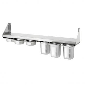 Nástěnná police Bartscher z nerezové oceli pro 6 gastronádob GN 1/6 různých hloubek. Vhodné např. na koření. Se vsuvkami pro zasazení GN. Gastronádoby objednávejte samostatně. Včetně upevňovacího materiálu. Rozměr: Š 1200 x H 200 x V 150 mm. Hmotnost 4,3 kg.