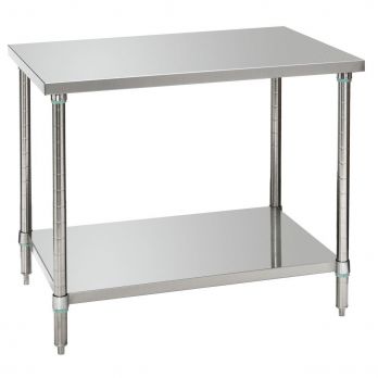 Pracovní stůl z chromniklové oceli 18/10 s plnou policí, s výškově nastavitelnými nohami. Zatížení horní desky do 160 kg. Zatížení spodní police do 120 kg. Výška mezi policí a pracovní deskou 660 mm. Lehká montáž. Rozměry: 1000 (Š) x 700 (H) x 860-900 (V) mm. Hmotnost: 22,0 kg.