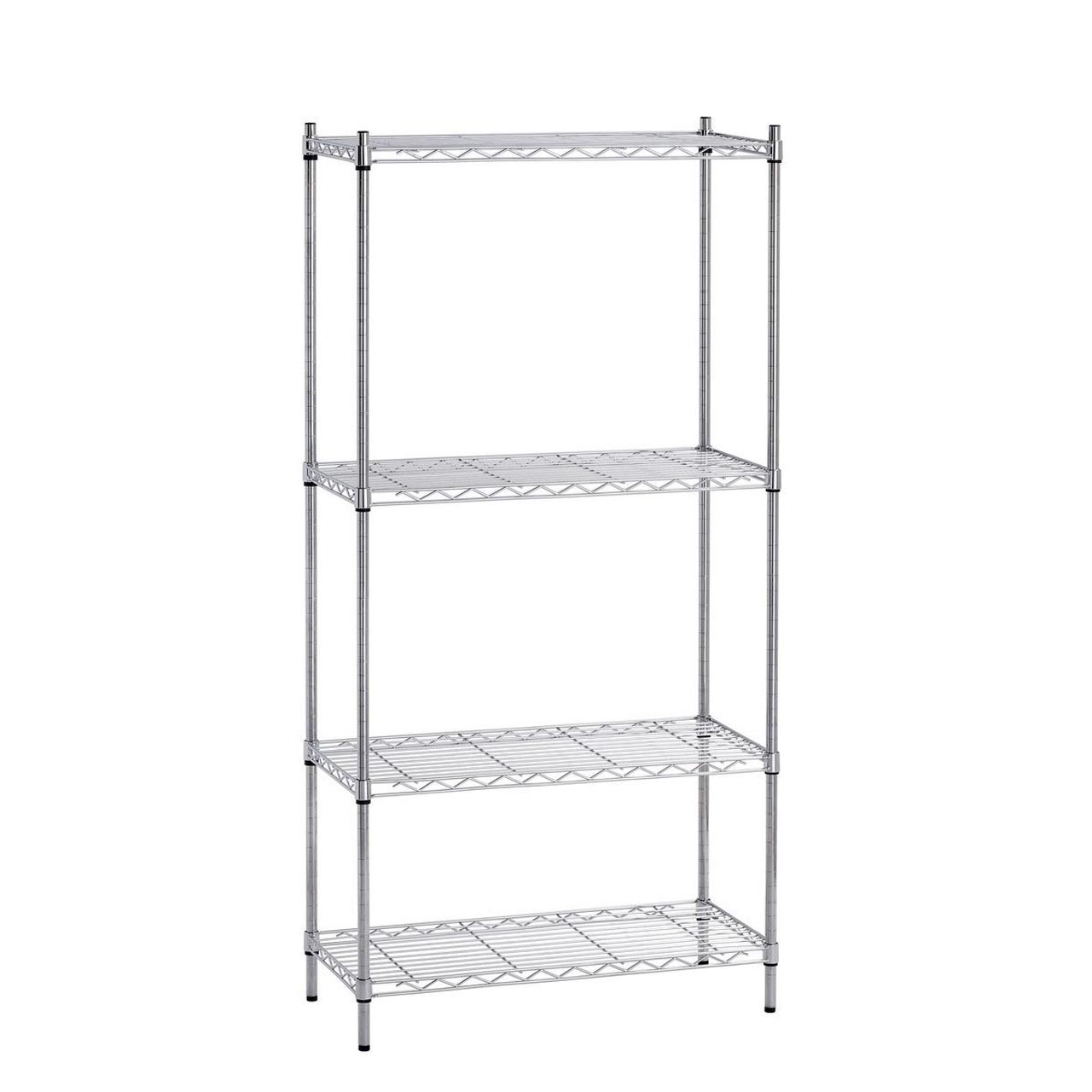 Regál z chromované oceli. 4 výškově nastavitelné police. Montážní sada se skládá ze 4 polic a 4 rohových sloupků (zásuvný systém). Snadná montáž.