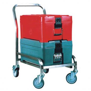 Manipulační vozík (bez pracovní plochy) na termoporty, vyrobený z chromniklové oceli 18/10. Jednoduchá konstrukce z nerezových profilů. 4 otočná kolečka o prům. 125 mm, z toho 2 s brzdou. Rozměry: 785×495×900 mm. Kapacita: 3x termoport AP 200. Nosnost: 100 kg. Hmotnost: 8 kg.