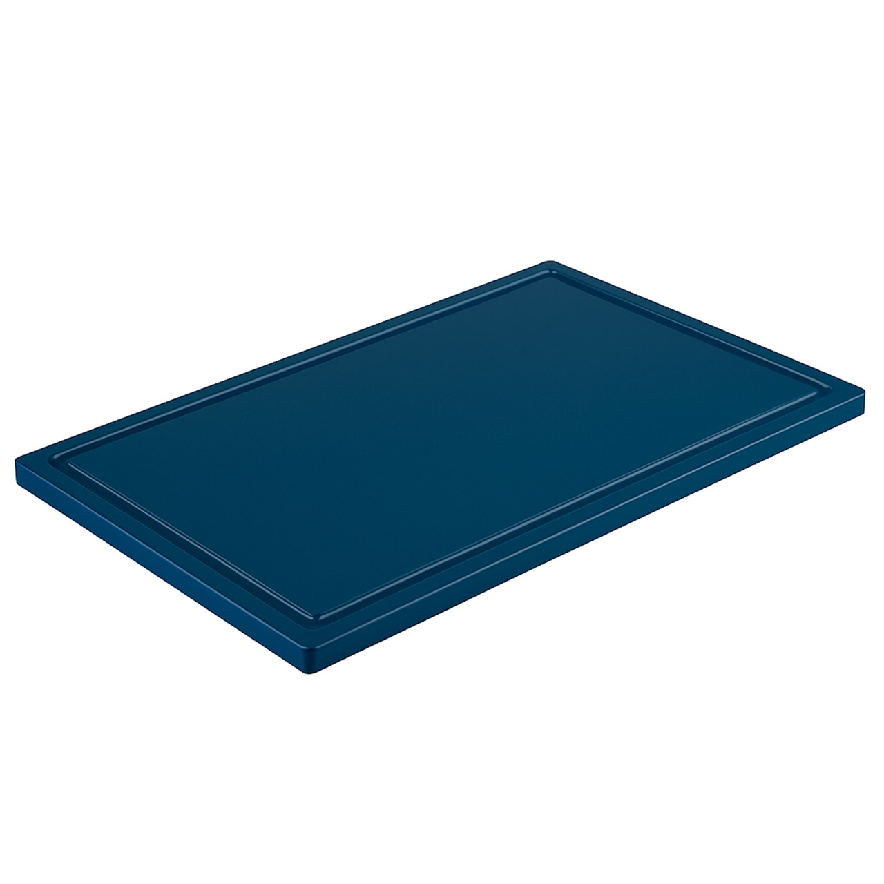 Plastová krájecí deska / prkno o rozměru 53 x 32,5 cm, výška 2 cm. Protiskluzové nohy a drážka po obvodu. Barva modrá.
