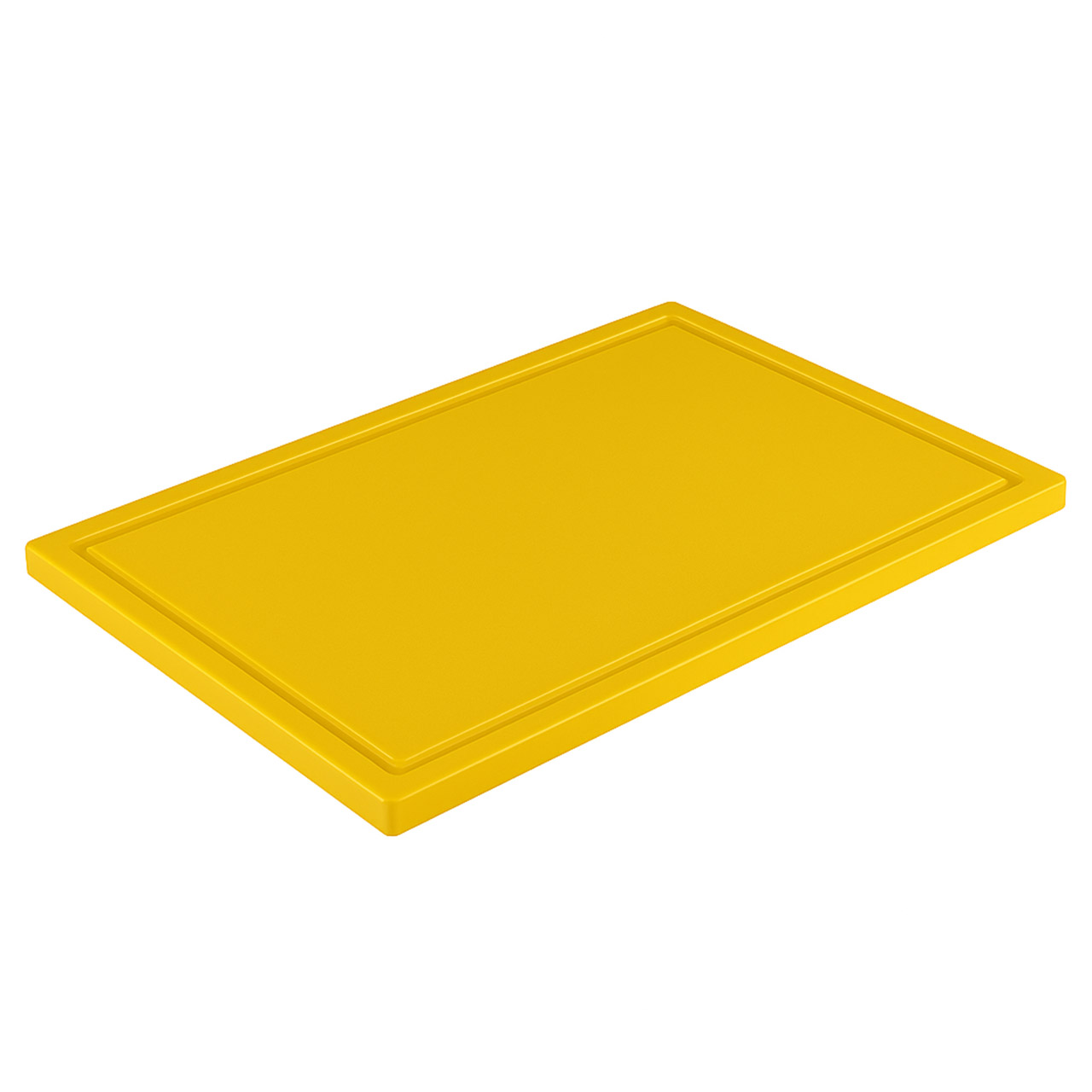 Plastová krájecí deska / prkno o rozměru 53 x 32,5 cm, výška 2 cm. Protiskluzové nohy a drážka po obvodu. Barva žlutá.