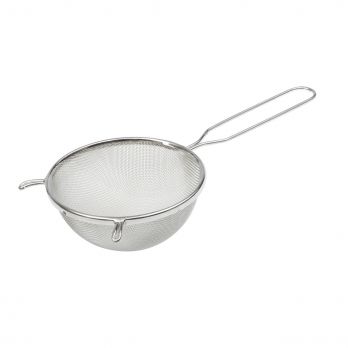 Kovové tkanivo pevně spojené s obrubou z ocelového plechu a držadlem s háčky z ocelového drátu. Galvanicky leskle pokoveno. Cedník hrubý řidší tkanivo s oky 1x 1 mm.