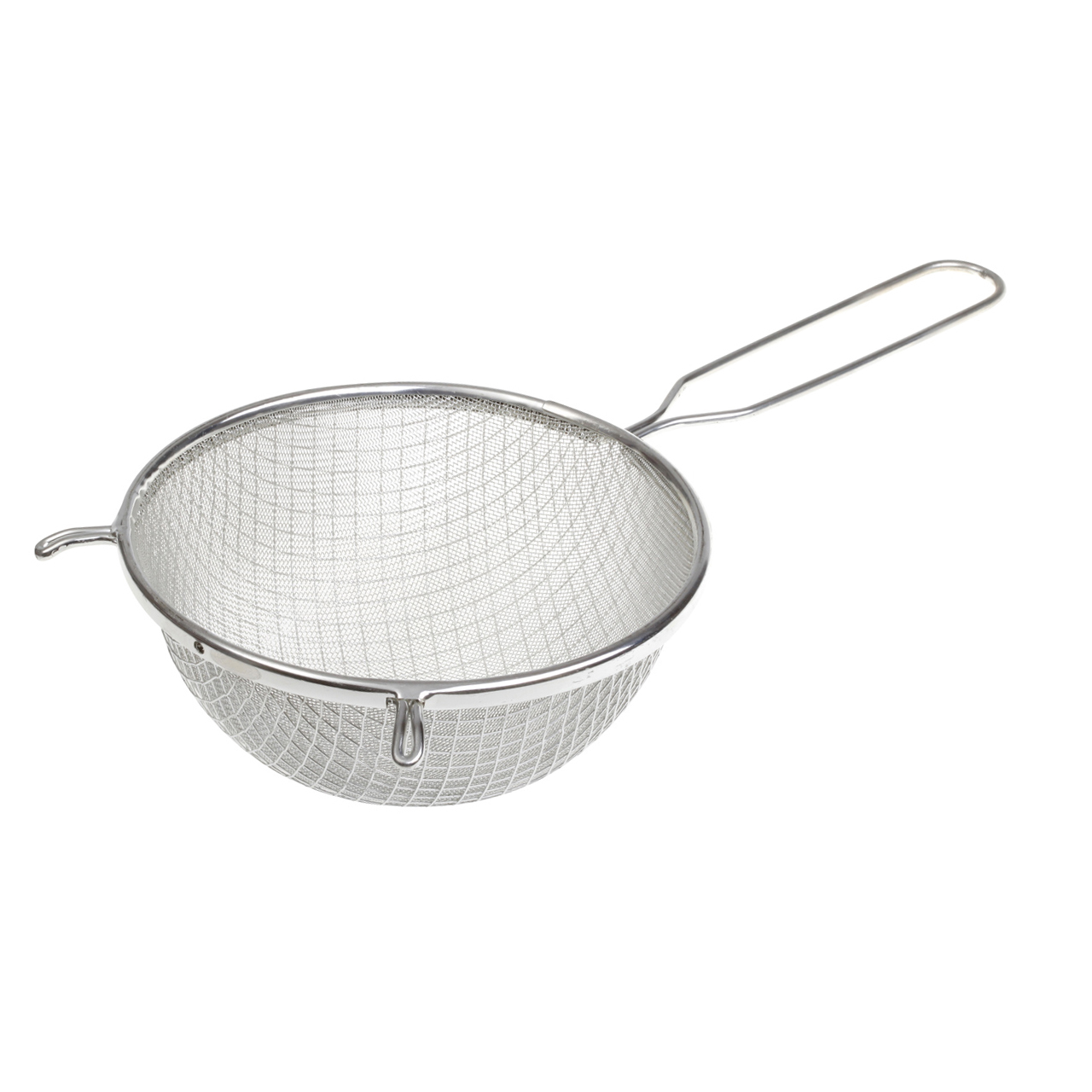 Dva druhy kovového tkaniva pevně spojeného s obrubou z ocelového plechu a držadlem s háčky z ocelového drátu. Vnější tkanivo s oky 6x 6 mm. Vnitřní tkanivo s oky 0,7x 0,7 mm. Galvanicky leskle pokoveno.