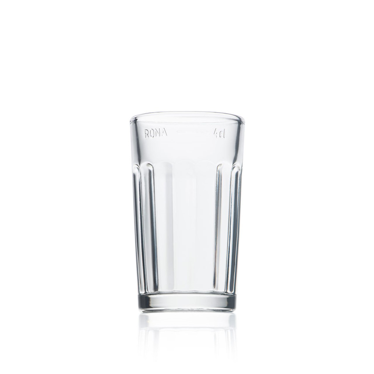 Sklenice (panák) na servis destilátů s cejchem 0,04 l.