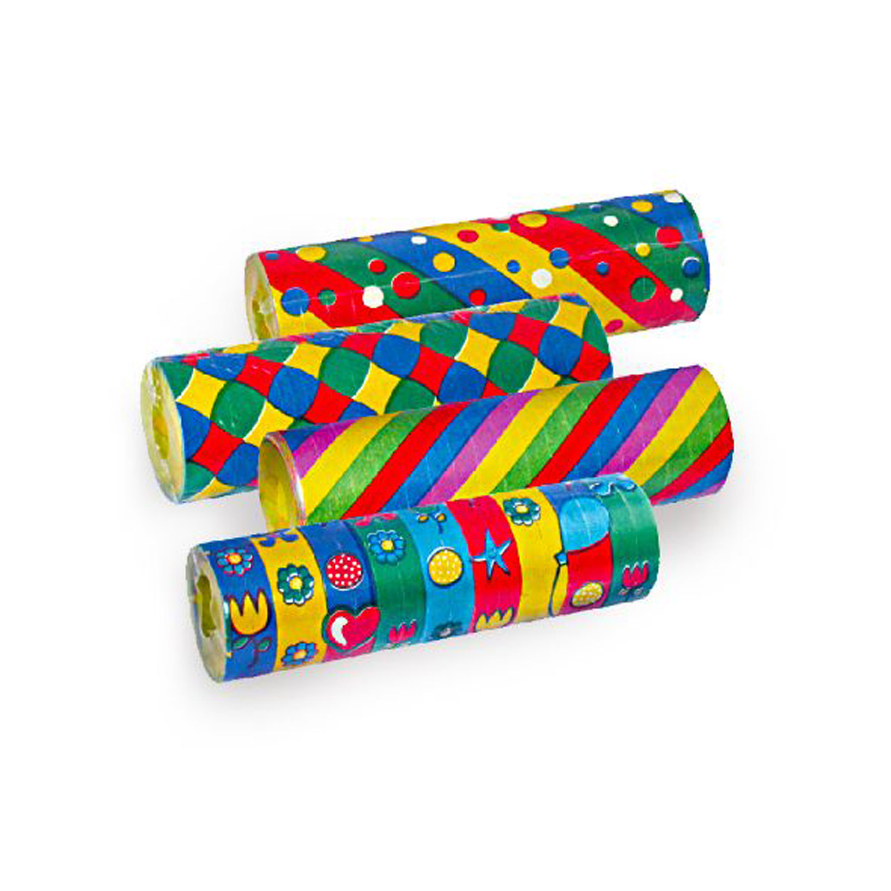 Papírové různě vzorované serpentiny v jasných barvách. V balení 18 ks proužků (každý proužek má šířku 7 mm a délku 4 m).