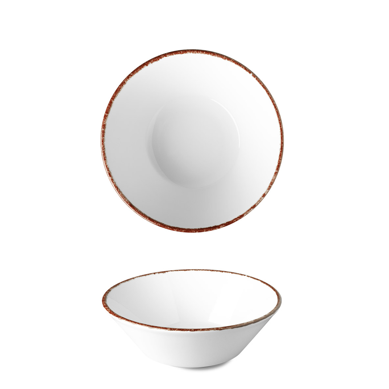 Bílá kónická mísa z řady porcelánu OPTIMO s hnědou linkou. Průměr mísy je 19,3 cm.