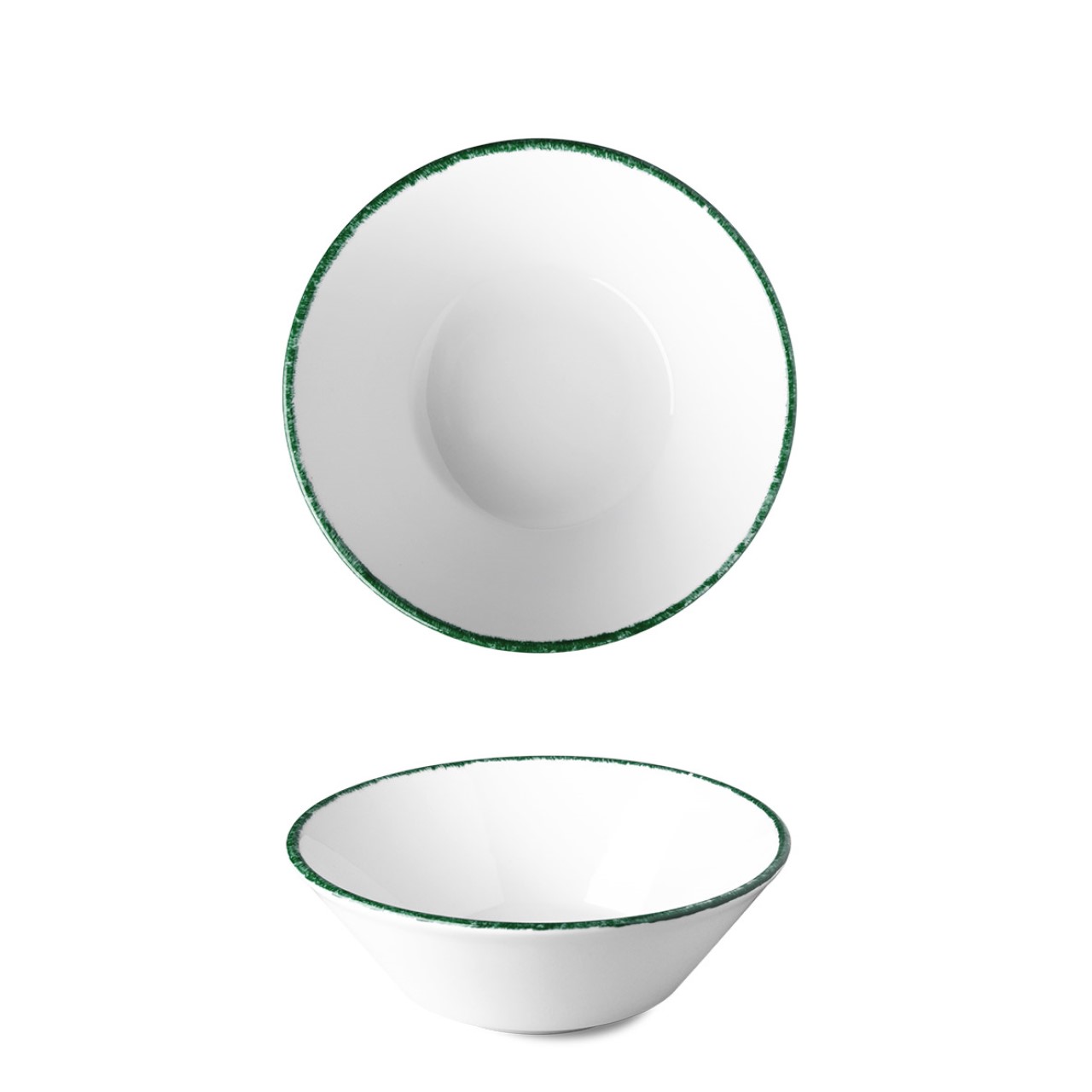 Bílá kónická mísa z řady porcelánu OPTIMO se zelenou linkou. Průměr mísy je 19,3 cm.