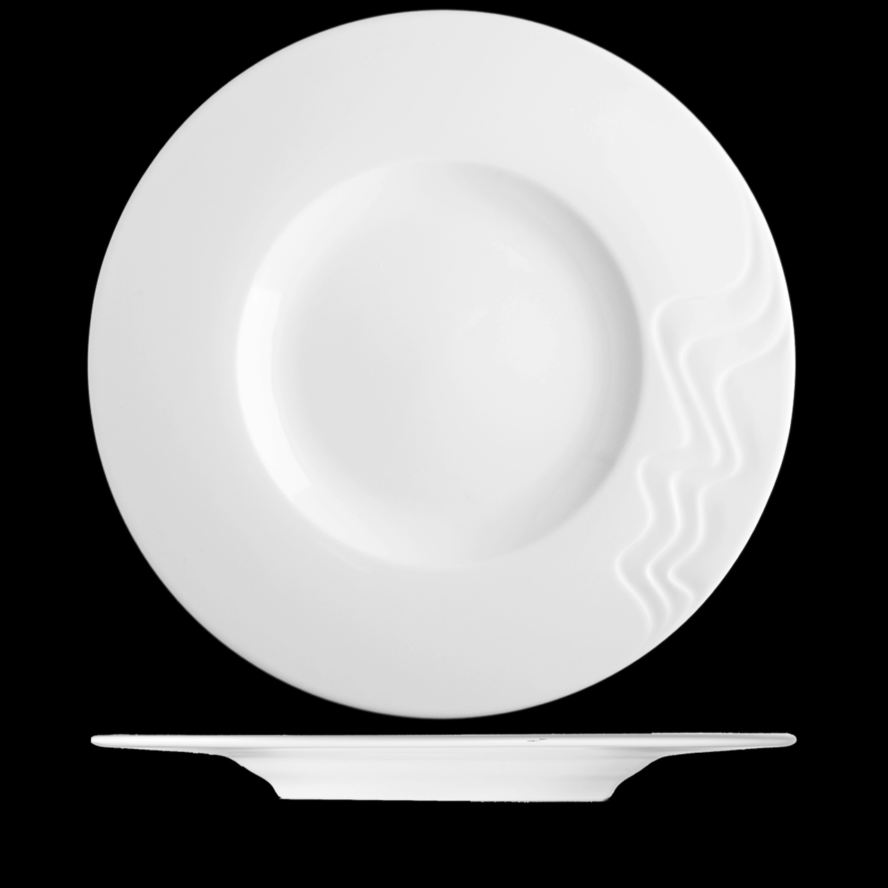 Mělký talíř s širokým praporem o průměru 33 cm.