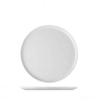 Mělký talíř o průměru 19 cm bez okraje s rovným dnem.