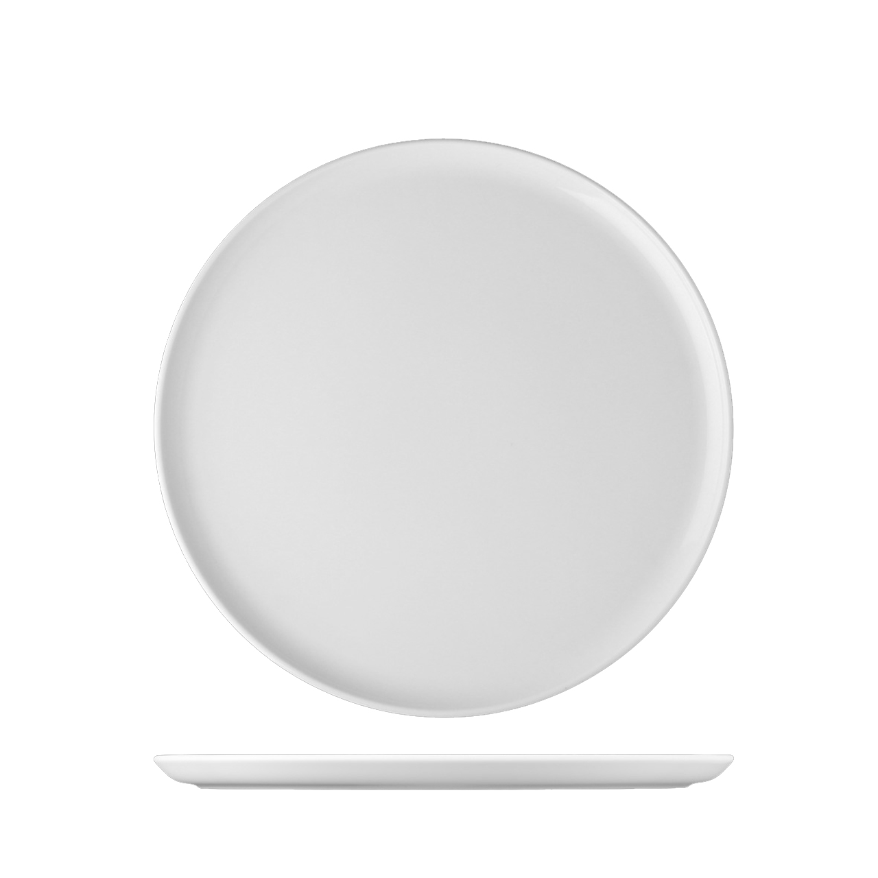 Mělký talíř o průměru 23 cm bez okraje s rovným dnem.