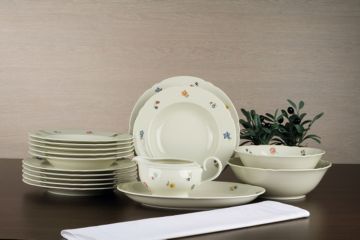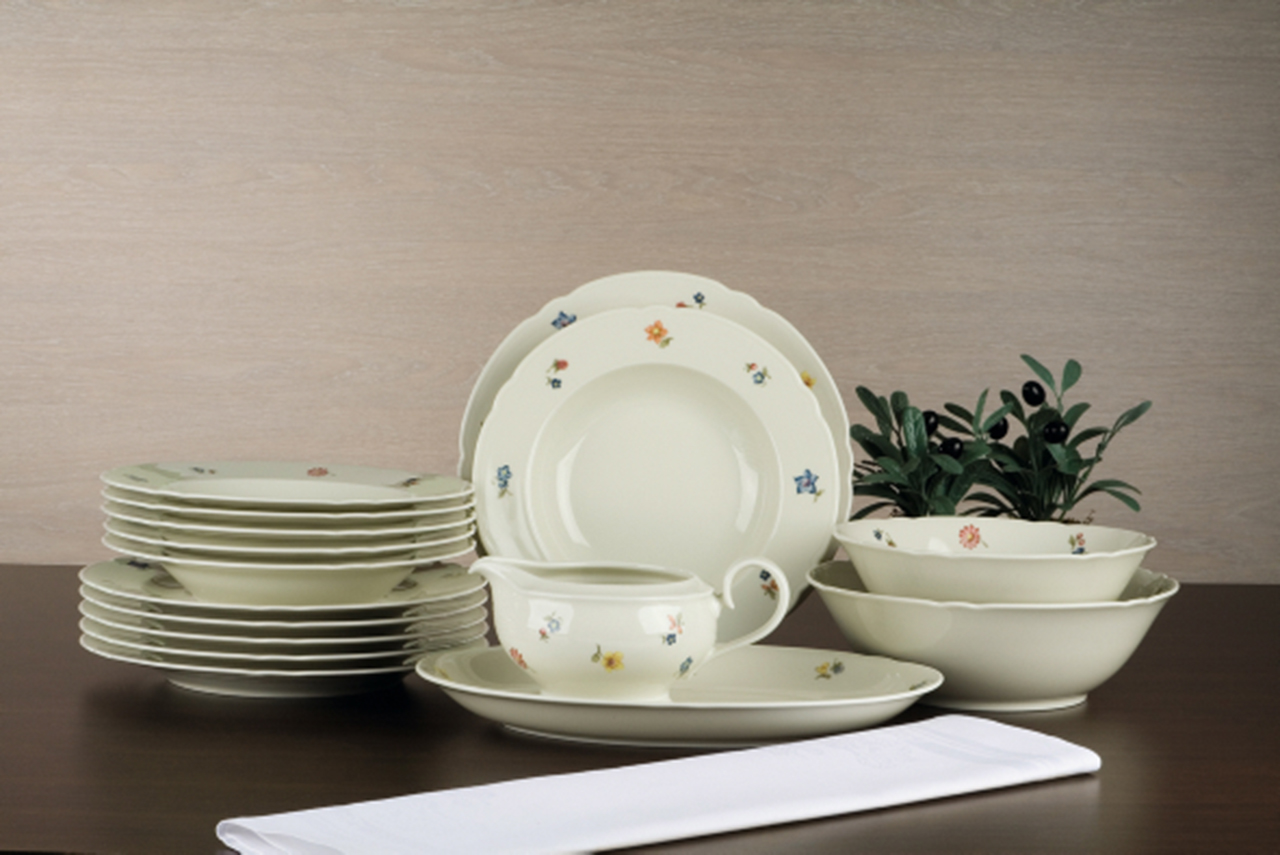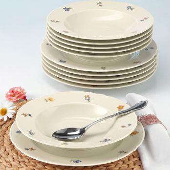Jídelní sada talířů a doplňků s květinovým dekorem obsahuje: 6 ks talíř mělký 25 cm, 6 ks talíř hluboký 23 cm, 1 ks omáčník 0,6 l, 1 ks mísa 20 cm, 1 ks mísa 23 cm, 1 ks podnos oválný 31 cm