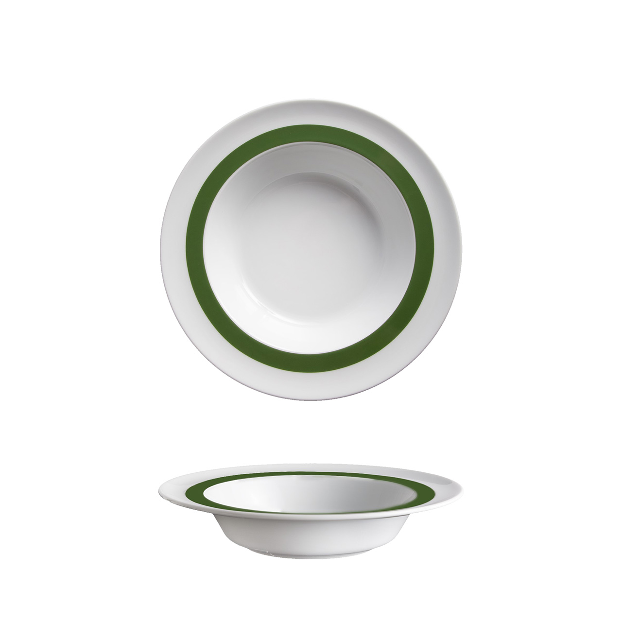 Hluboký talíř o průměru 23 cm se zeleným dekorem. Díky speciálním detailům, jako jsou kontrastní barvy, zarážky na talířích pro snadné nabírání soust je porcelán ACTIVE určen lidem s motorickými obtížemi i seniorům.