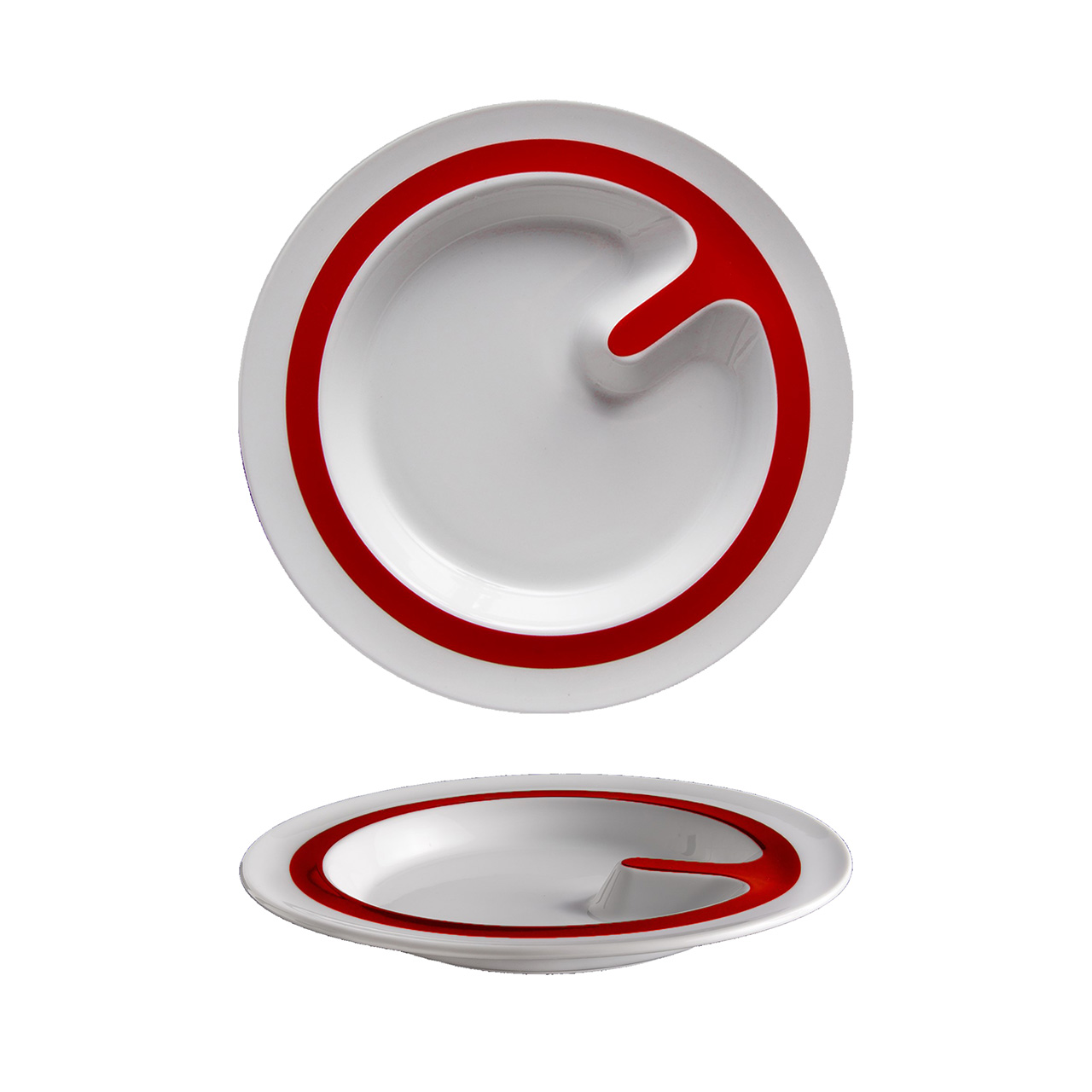 Speciální polohluboký talíř o průměru 26 cm s červeným dekorem. Díky speciálním detailům, jako jsou kontrastní barvy, zarážky na talířích pro snadné nabírání soust je porcelán ACTIVE určen lidem s motorickými obtížemi i seniorům.