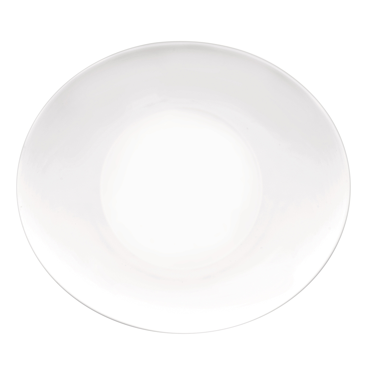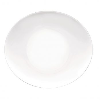 Talíř mělký o rozměrech 27 x 24 cm z opálového skla s jemným vzorem.