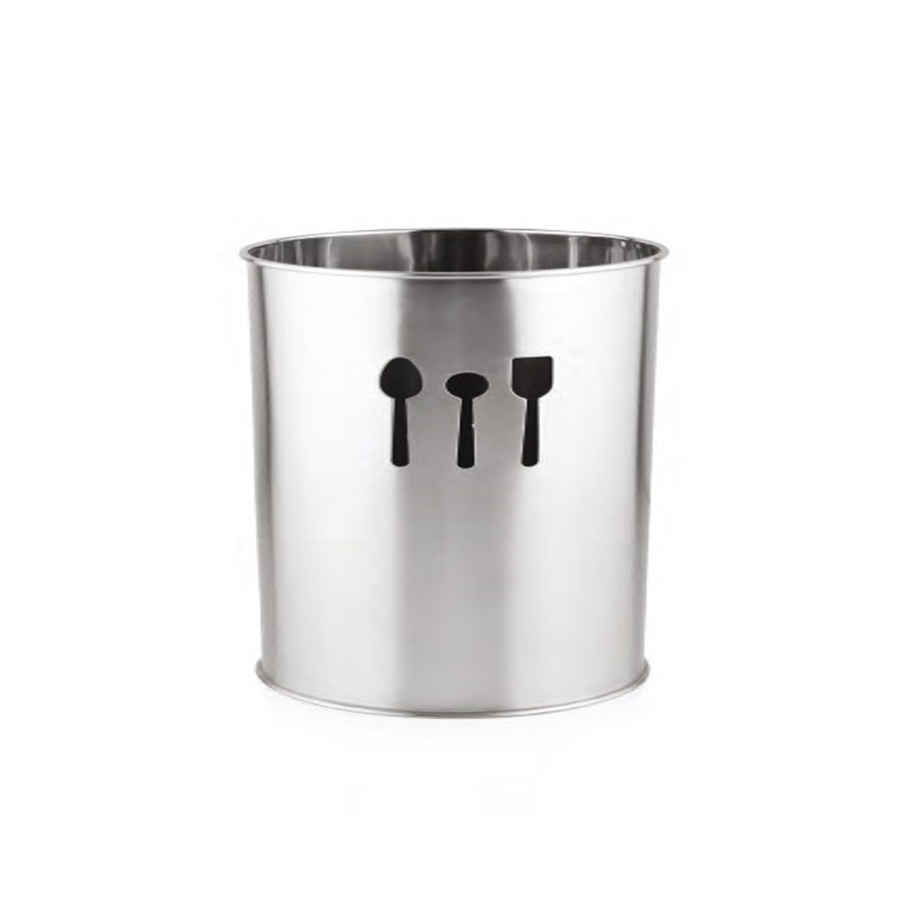 Stojan na příbory nerezový s dekorem. Průměr 10 cm a výška 11 cm.