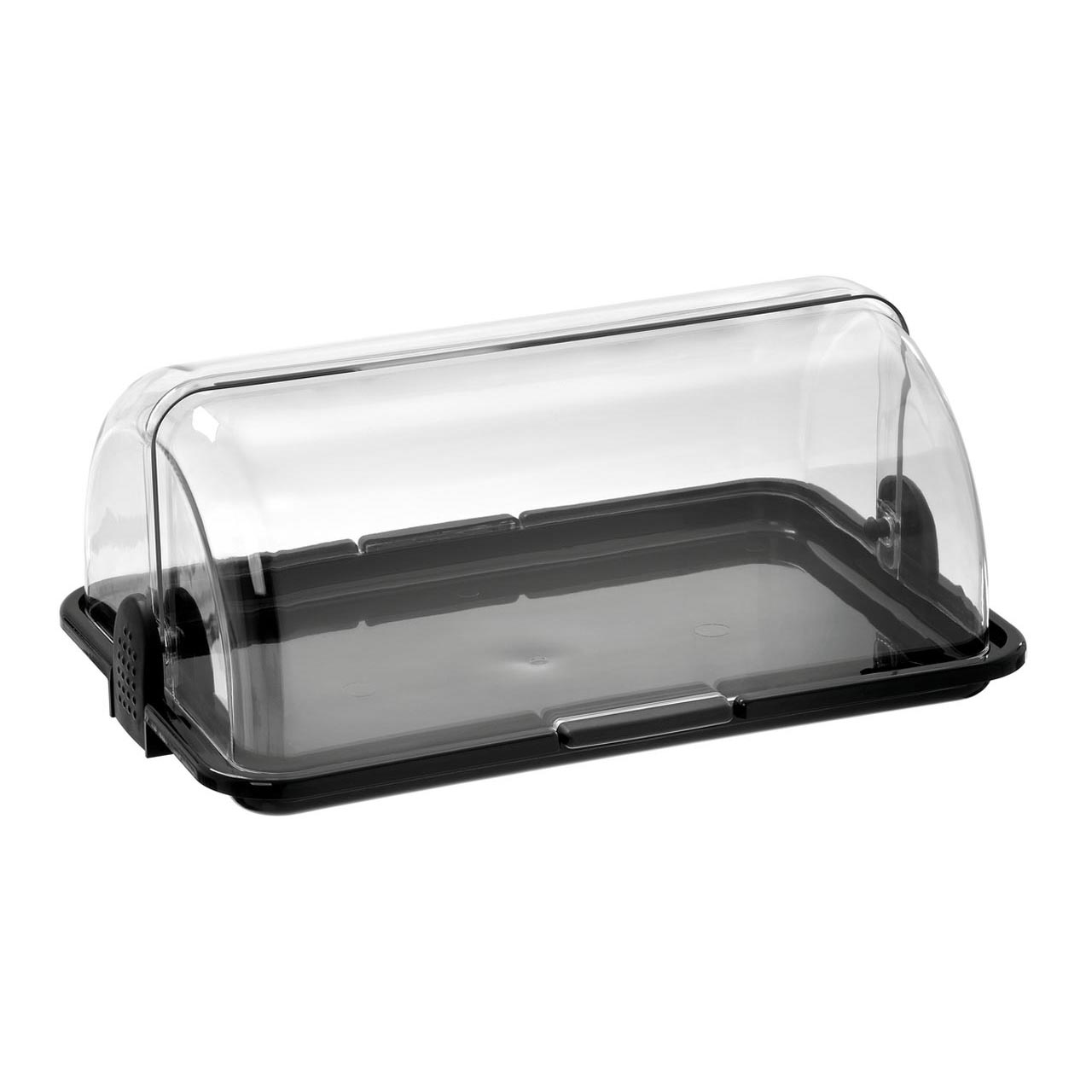 Bufetová vitrína bez chlazení pro bufetový stůl. Průhledné rolovací víko nabízí obsluhu z obou stran a také přímý pohled na podávané lahůdky. Barva černá. Odnímatelný poklop. Plocha spodní části Š 420 x H 270 mm. Jednoduchá obsluha a údržba. Materiál odolný průhledný plast. Rozměr: 465 x 315 x 195 mm. Hmotnost 1,43 kg.