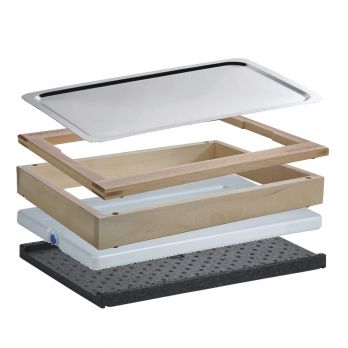 Kompletní ICE modul, skládá se z těchto komponentů: 1xzákladní rám dřevěný výška 6,5cm, 1x horní krycí rámeček, 1x termodeska, 1x chladící deska Cool Pack -3st.C, 1x Gastronádoba GN 1/1x2cm. Dřevo je chráněno bezbarvým lakem, který dává vyniknout kráse dřeva. Lak je určen pro styk s potravinami. Všechny komponenty se dají objednat samostatně.