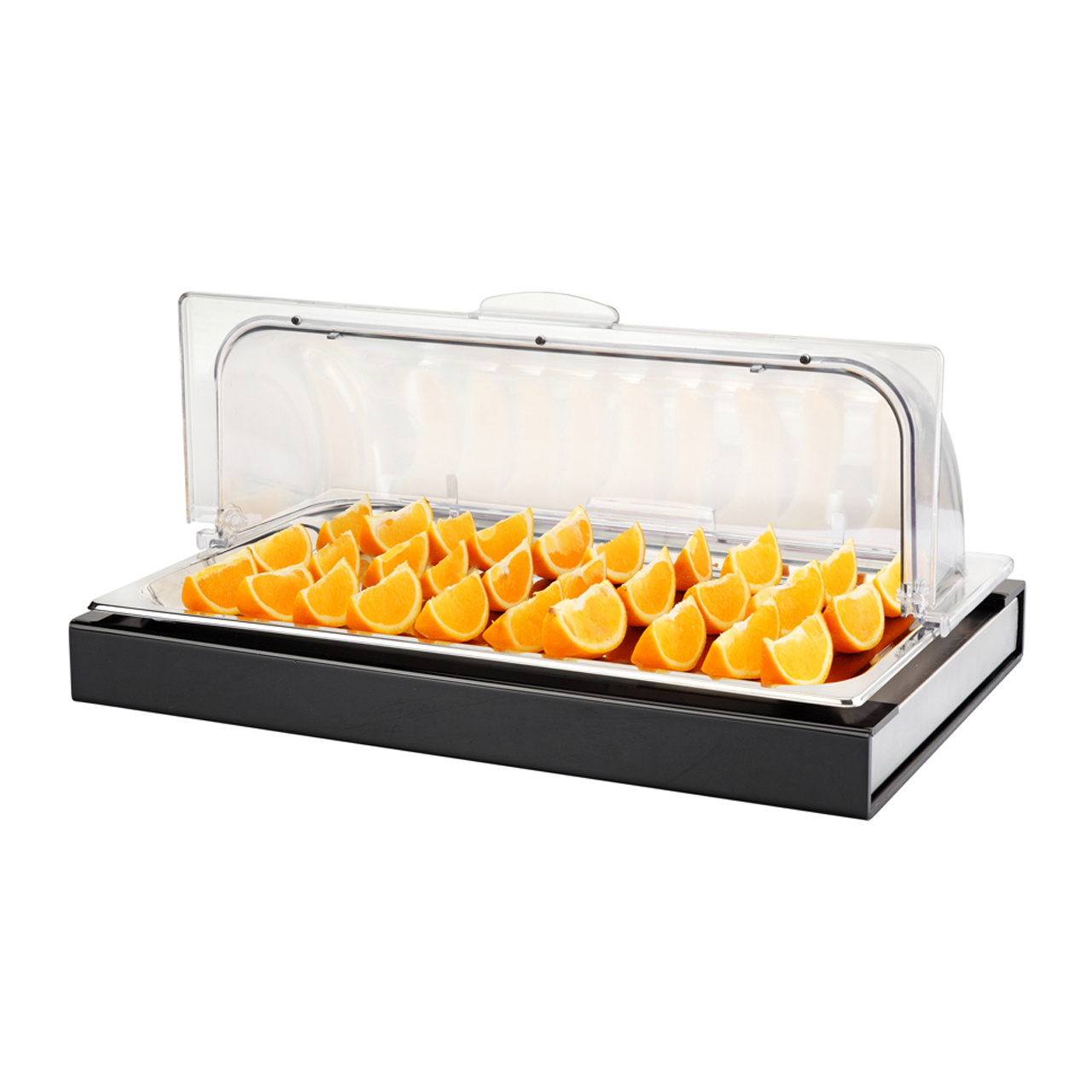 Buffetová vitrína GN 1/1 s roltopem z polykarbonátu, akrylový rám, nerezová nádoba, chladící nerezová vložka GN 1/1.