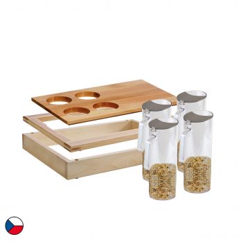 Neutrální modul s nástavcem se čtyřmi otvory pro karafy na cereálie je kompletní řešení pro snídaňový bufet. Tato sestava obsahuje 1 základní rám (58 x 40,5 x 6,5 cm), doplněný o horní dřevěný rám určený pro GN 1/1, ostatní příslušenství: horní nástavec se čtyřmi otvory, 4 x karafa polycarbonátová. Neutrální dřevěný dekor jemně doladí každé prostředí, ať už jde o hotelovou snídaňovou zónu, firemní bufet nebo cateringové akce. Díky jednoduchému modulárnímu systému lze sestavu snadno přesouvat, kombinovat a přizpůsobovat konkrétním prostorům.