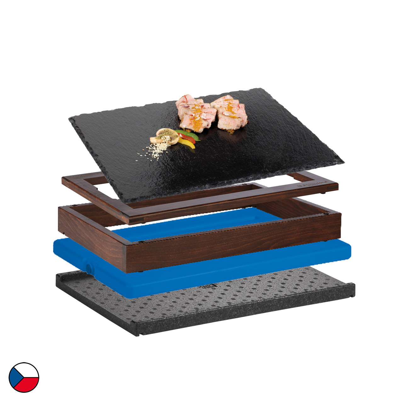 Chlazený modul v tmavém provedení s břidlicovou deskou je kompletní řešení pro studený bufet. Tato sestava obsahuje 1 základní rám (58 x 40,5 x 6,5 cm), doplněný o horní dřevěný rám určený pro GN 1/1, ostatní příslušenství: černá termoizolační podložka, chladicí vložka, břidlicový podnos GN 1/1. Dřevěný dekor v tmavém provedení jemně doladí každé prostředí, ať už jde o hotelovou snídaňovou zónu, firemní bufet nebo cateringové akce. Díky jednoduchému modulárnímu systému lze sestavu snadno přesouvat, kombinovat a přizpůsobovat konkrétním prostorům.