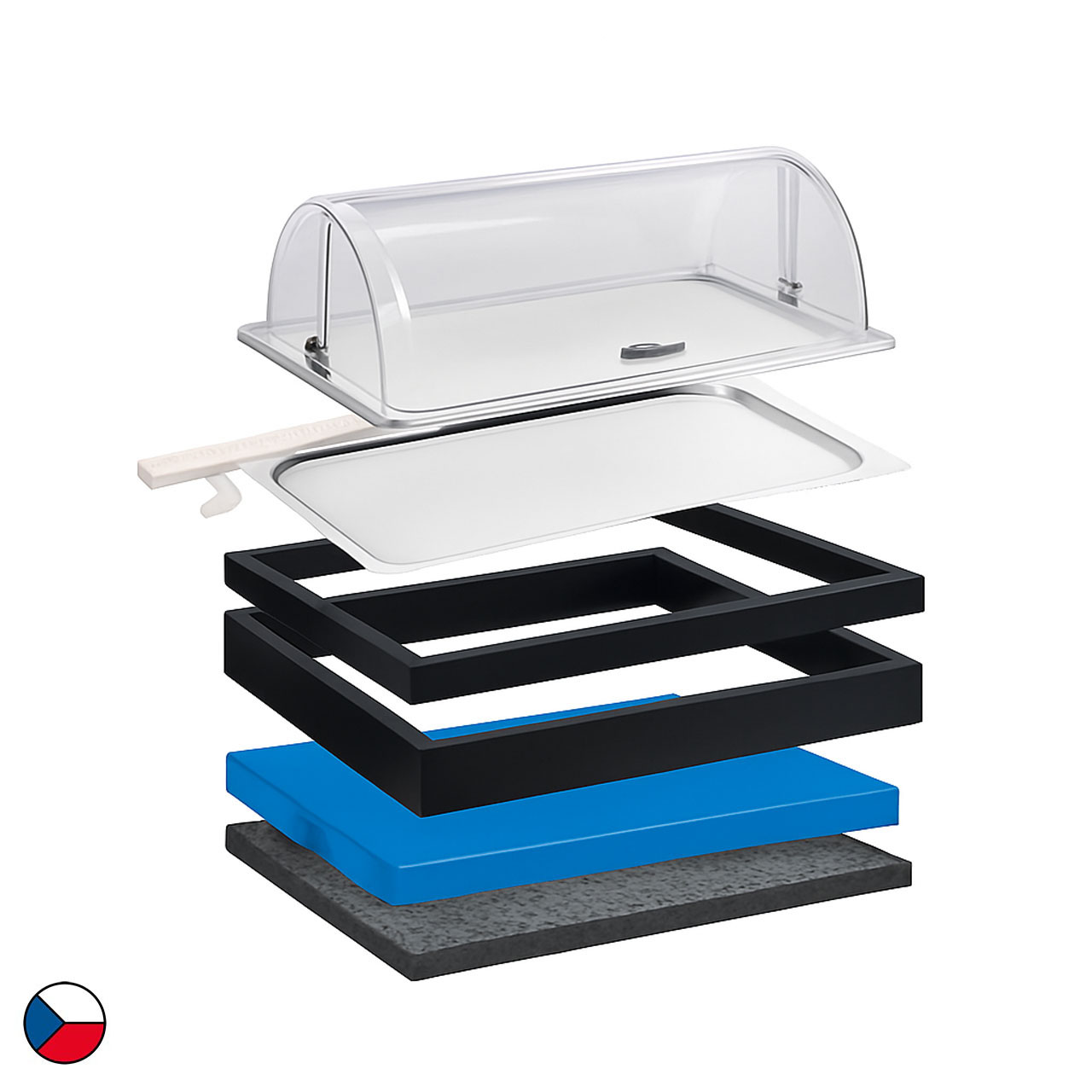 Chlazený modul je kompletní řešení pro studený bufet. Tato sestava obsahuje 1 základní rám (58 x 40,5 x 6,5 cm), doplněný o horní dřevěný rám určený pro GN 1/1, ostatní příslušenství: černá termoizolační podložka, chladicí vložka, nerezová gastronádoba GN 1/1-20 mm, akrylový roll-top poklop, zajišťovací lišta. Černý dřevěný dekor doladí každé prostředí, ať už jde o hotelovou snídaňovou zónu, firemní bufet nebo cateringové akce. Díky jednoduchému modulárnímu systému lze sestavu snadno přesouvat, kombinovat a přizpůsobovat konkrétním prostorům.