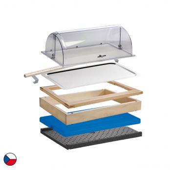 Chlazený modul je kompletní řešení pro studený bufet. Tato sestava obsahuje 1 základní rám (58 x 40,5 x 6,5 cm), doplněný o horní dřevěný rám určený pro GN 1/1, ostatní příslušenství: černá termoizolační podložka, chladicí vložka, nerezová gastronádoba GN 1/1-20 mm, akrylový roll-top poklop, zajišťovací lišta. Neutrální dřevěný dekor jemně doladí každé prostředí, ať už jde o hotelovou snídaňovou zónu, firemní bufet nebo cateringové akce. Díky jednoduchému modulárnímu systému lze sestavu snadno přesouvat, kombinovat a přizpůsobovat konkrétním prostorům.