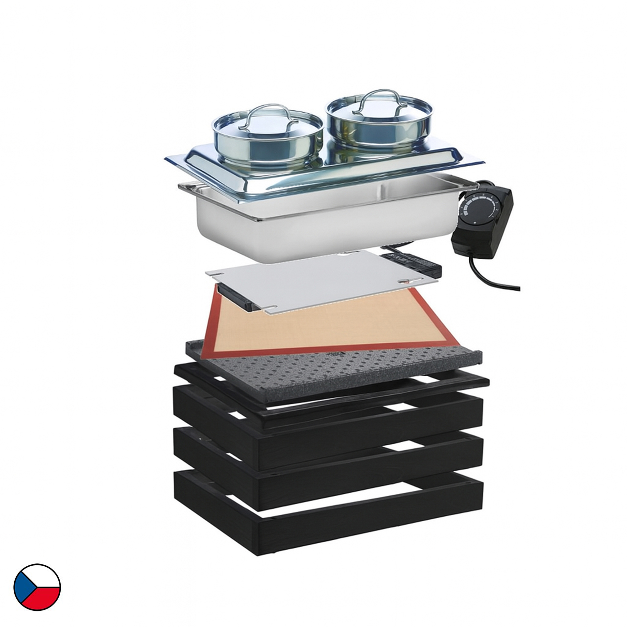 Vyhřívaný polévkový modul je kompletní řešení pro teplý bufet. Tato sestava obsahuje 3 základní rámy (58x40,5x6,5 cm), doplněné o horní dřevěný rám určený pro vodní lázeň, ostatní příslušenství: černá termoizolační podložka, silikonová vložka, elektrické topení 400 W, 1 x polévkový nástavec se dvěma nádobami na polévku o objemu 4,5 l, 2 x polévková naběračka na polévku. Černý dřevěný dekor jemně doladí každé prostředí, ať už jde o hotelovou snídaňovou zónu, firemní bufet nebo cateringové akce. Díky jednoduchému modulárnímu systému lze sestavu snadno přesouvat, kombinovat a přizpůsobovat konkrétním prostorům.
